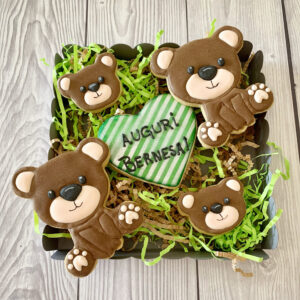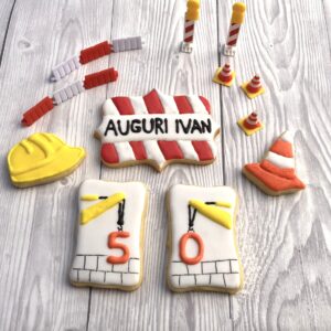 Ingredienti: Biscotto: burro, farina, uova, zucchero a velo, vaniglia Glassa: bianco d’uovo pastorizzato, zucchero a velo, limone, coloranti, alimentari