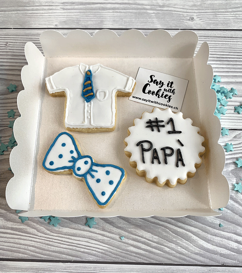 Dimensione: papillon: 5 x 3 cm; camicia: 5 x 7 cm ; biscotto rotondo: 5,5 cm